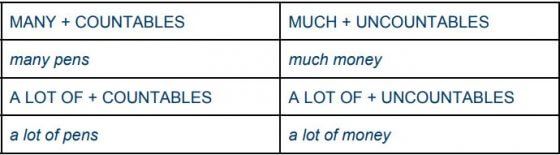 We use many, much, a lot (of) to refer to big quantities. We use ‘many’ with countable nouns and ‘much’ with uncountable nouns, and we can use ‘a lot (of)’ with both countable and uncountable nouns. In modern English it is very common to use ‘a lot (of)’ in affirmative sentences instead of ‘many’ and ‘much’.