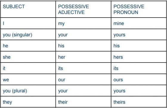 Here is a chart with both the possessive adjectives and pronouns for you to use as a reference: